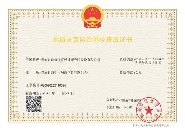 近日,公司獲得由青海省自然資源廳頒發(fā)的“地質(zhì)災(zāi)害評估和治理工程勘查設(shè)計資質(zhì)(乙級)”,標(biāo)志著公司在地質(zhì)災(zāi)害防治領(lǐng)域的業(yè)務(wù)能力和專業(yè)實(shí)力邁上新的臺階。